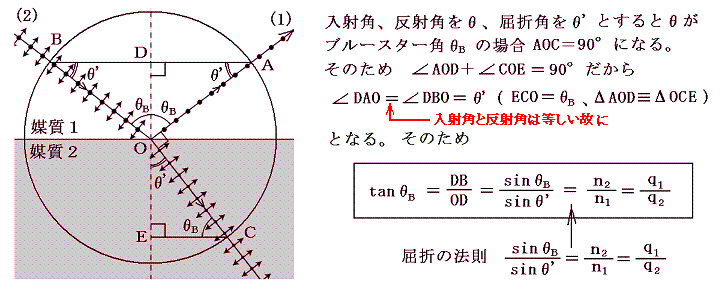 今媒質1から媒質2へブルースター角θBで入射したとする。そのとき媒質1、2の絶対屈折率をn1、n2、光速度をq1、q2そして入射側媒質1に対する透過側媒質2の相対屈折率をn12とすると tanθB=n2/n1=q1/q2=n12 の関係が成り立つ。