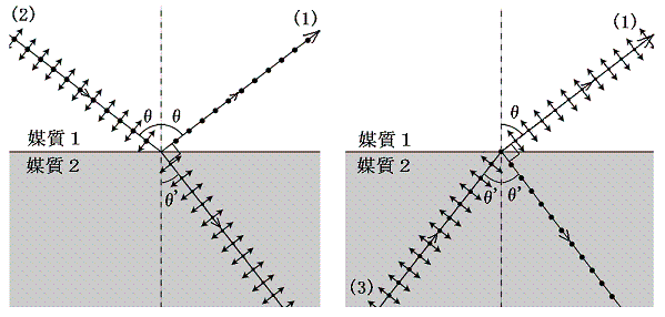 下左図のように、媒質1から媒質2へ向かって光線がブルースター角で入射しているとする。