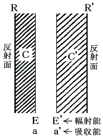 キルヒホフは無限に広い等温度の物質CとC’が向かい合っており、その背面は完全な反射面RとR’である系を考えた。Cの単位面積を単位時間にでる放射エネルギーを“輻射能”と呼びEで表す。Cに入射した輻射エネルギーの内でCに吸収されるものの割合を“吸収能”と呼びaで表す。同じ能という言葉が付いているが E(J/m2s) と a(無次元量) の物理的意味は全く異なることに注意。