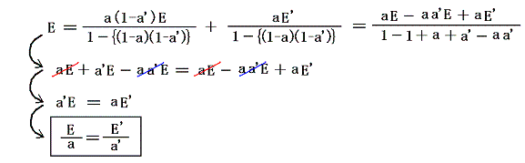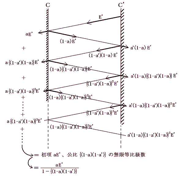 このCとC’の間に存在する輻射の平衡状態を考える。Cが放射Eを出すと、C’はa’Eを吸収し、(1-a')EをCに向かって反射する。そのうちのa(1-a')EがCに吸収され、残りの(1-a)(1-a')EがC’に向かって反射される。以下同様に考えると、下図の左側の無限級数の和が、Cが自ら発した放射Eの内で取り戻したものである。