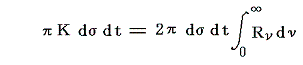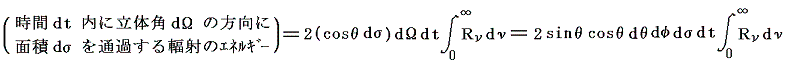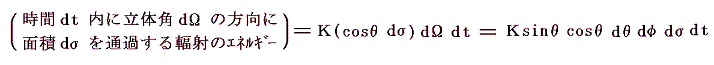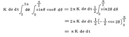 ここで、面積要素dσを通って一方の側(例えばθ=0〜π/2の側)に進む輻射の総エネルギー流を求めておこう。これは前記の式のθを0〜π/2、方位角φを0〜2πまで積分すればよい。Kはすべての方向に対して一様だから積分記号の前に出せて