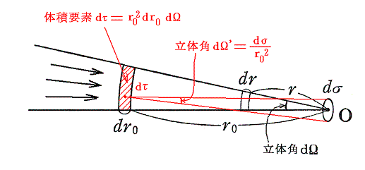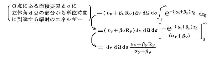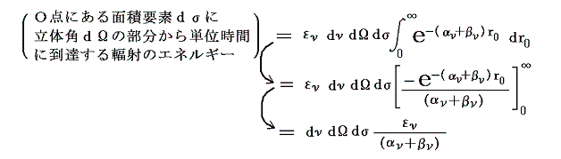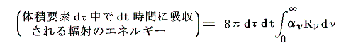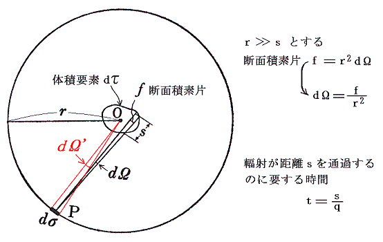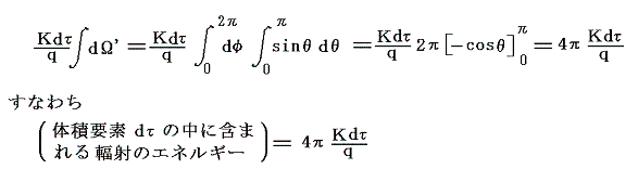 ここで円筒状の体積素片fsを体積要素dτにわたってすべて加え合わせる。それをさらに半径rの位置の面積要素dσを全球面にわたって加え合わせると、dt時間に体積要素dτの物体の中で吸収される輻射エネルギーを求めることができる。