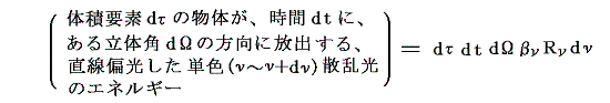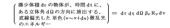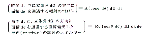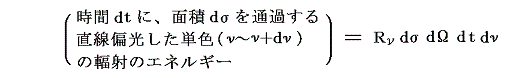 が成り立つ。ここでRνは単色(振動数νを中心とした単位の振動数幅に含まれる)で直線偏光した単位立体角の方向へ進行する輻射輝度を表す。
