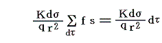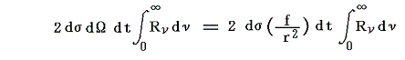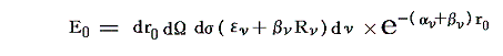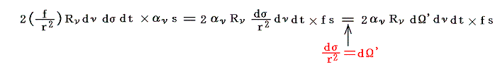 このとき体積要素dτ中の円筒状体積素片fsに含まれるエネルギーは、輻射エネルギーの通過速度が光速qであることを考慮すると、上式のdtをdt=s/qとすれば良いことが解る。ここで立体角 dΩ=f/r2 だから