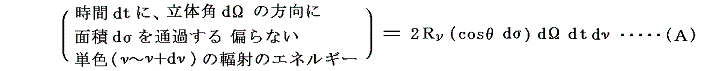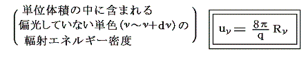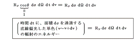 ここで単色(νを中心とした単位の振動数幅に含まれる)で偏光面が片寄った、単位立体角の方向へ単位時間に進行する輻射の“輝度” Rνを定義しよう。