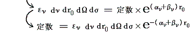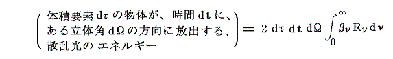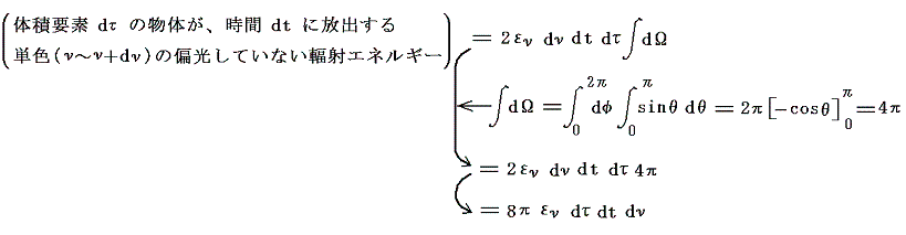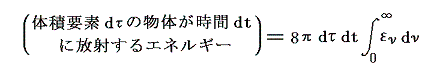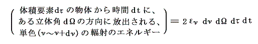 体積要素dτの物体が、時間dtに、ある立体角dΩの方向に放出する、振動数がν〜ν+dνの間にある輻射のエネルギーは以下のように表される。