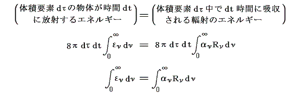 物体と輻射の間に熱的平衡が実現していれば、体積要素dτについて前項1.と2.で求めた[放出される量]と[吸収される量]が等しくなければならないので