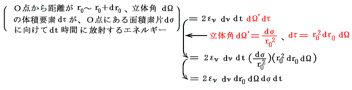球面上に取った面積要素dσを通り立体角dΩにdt時間に流れ出ていく輻射のエネルギーは体積要素dτが球の中心付近にあるために、前項の結論