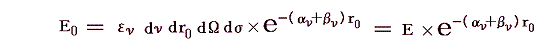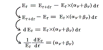 これらのすべての可能性を考慮して、 I の内、第1媒質の体積要素から放出された部分を、その成分がどんな経路を取ってきたかに関係なく I1 で表す。同様に第2媒質、第3媒質・・・から放出されたものを I2、I3、・・・・ と表すと