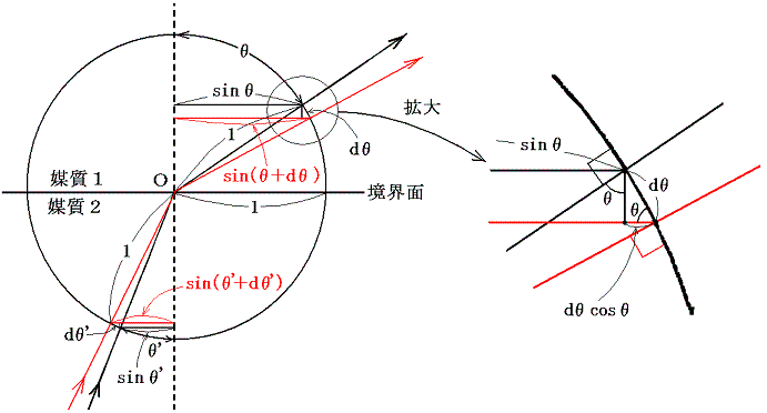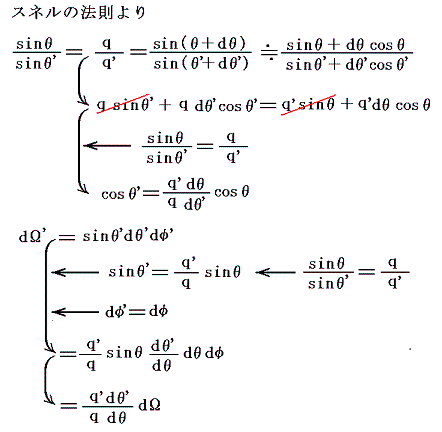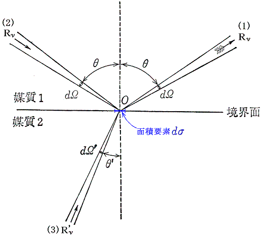 境界面は滑らかと考えているので“面積要素”dσから(1)の方向へ向かう輻射線は次の二つの要素の和であると考えることができる。