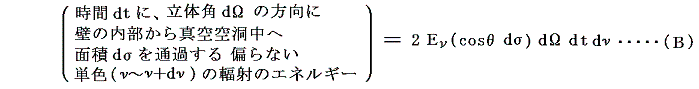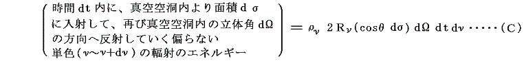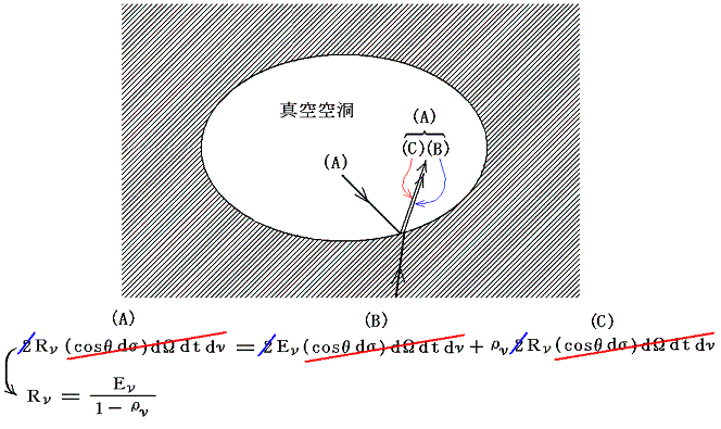 このとき、[壁から真空空洞中へ輻射されるエネルギー]は[dσを通過して壁の媒質から放射されるエネルギー]と、[dσによって反射される真空空洞内からの輻射エネルギー]の和となる。