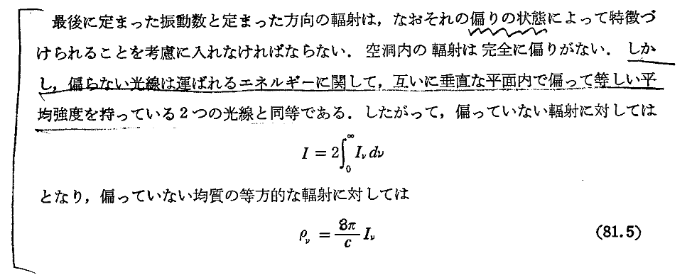 このように偏光していない光線を偏光した光線によって表すと係数2が乗ぜられるが、それは電磁波が横波なので二つの偏りを持つことができることによる。実際偏光していない輻射線をニコルプリズムなどを通して直線偏光成分だけにすると、そのエネルギー強度は1/2倍になることが確かめられる。