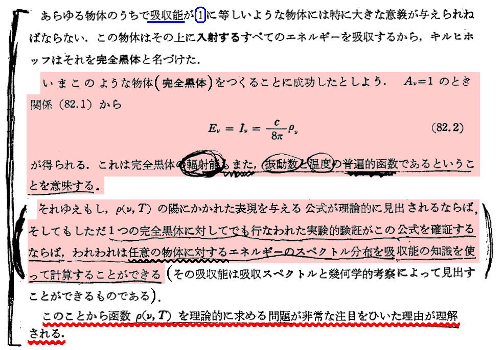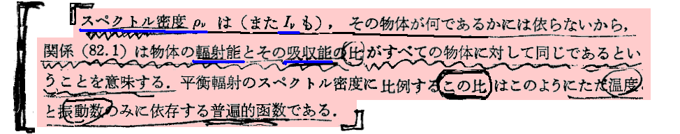 上記の部分の証明は簡単なのですが、ここは物体と熱力学的平衡にある輻射のエネルギー密度のスペクトル分布の仕方(つまり振動数への依存性)が温度によって変わるだけで物質の性質に拠らないということです。