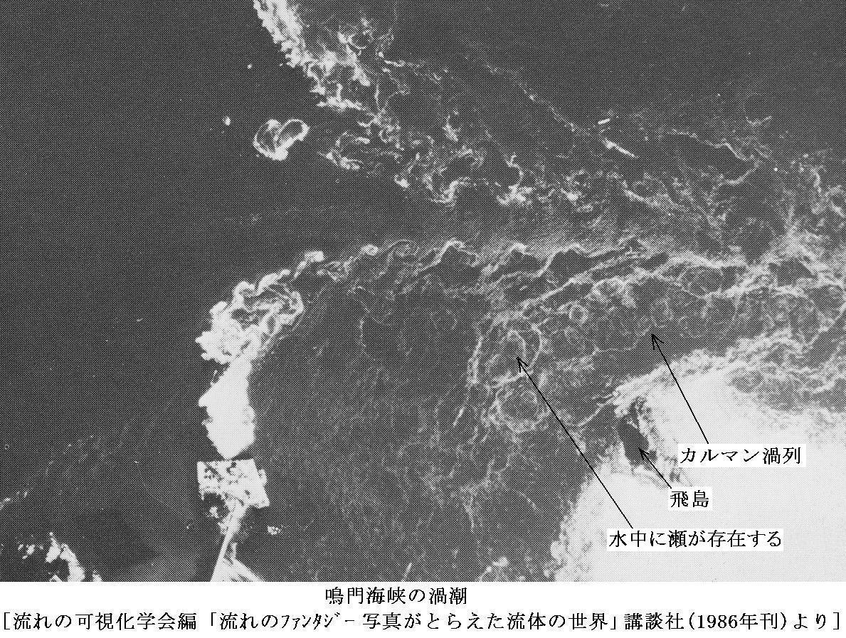 次の写真は鳴門海峡に生じた渦列です。大鳴門橋ができる前の古い写真ですが、上に述べた事柄の実例として興味深い。鳴門海峡を北から南に向かって流れ出る潮流と岬の陰の止水域とで速度差が生じる境界線上に渦列が生じている。