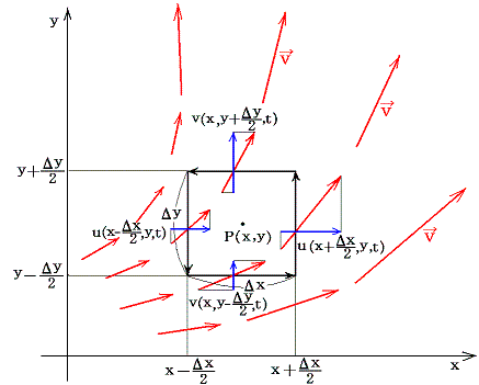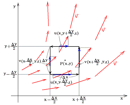 次図の様な速度場vが存在したとき、次式で定義されるmを点P(x,y)に於ける発散という。つまり、下図のようにxy平面上に存在する速度ベクトルvについて、微少な四角形ΔxΔyの各辺を横切る成分を積算する。