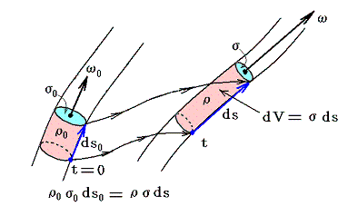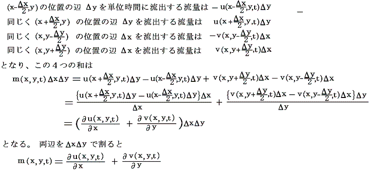これは小さな閉曲線を横切って単位時間に流れ出す流体の体積を意味する。今考えているような非圧縮生流体の場合は、境界線を越えて単位時間に流れ出す質量だと言っても良い。この値mが正ならばその点に単位時間当たり体積m(あるいは質量m/ρ)の湧き出しがあることになり、負ならば吸い出しがあることになる。
