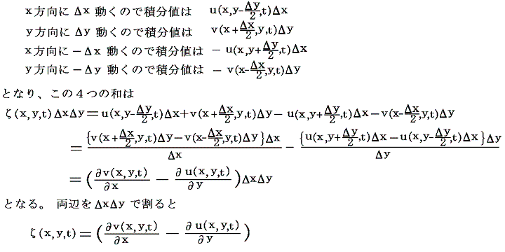 となる。閉曲線の経路に沿った方向の速度成分を線積分したものを循環という。渦度は、循環の閉曲線を無限に小さく一点に縮めた場合の値のことです。