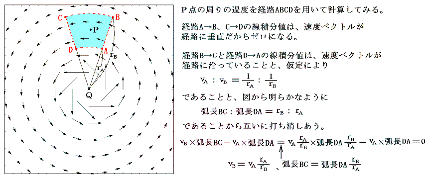 ここで注意してほしいことは速度ベクトル場が回転していることが渦度の存在を意味するのでは無いと言うことです。たとえば、回転速度がある点Qからの距離rに逆比例するような回転のベクトル場の場合