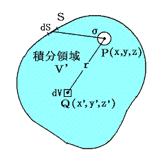 この場合には積分動点Qが定点Pに近づくとr=0となり、1/rもΔ(1/r)も不定になる。従ってΦ、Ψのいずれも有限確定な連続関数であるという仮定の下に得られたGreenの定理をそのまま使うことはできない。そのためP点を中心とするきわめて小さい半径εの球面σを描いて、その内部を積分領域Vから取り除いて、残りの領域V’に対してGreenの定理を適用することにする。