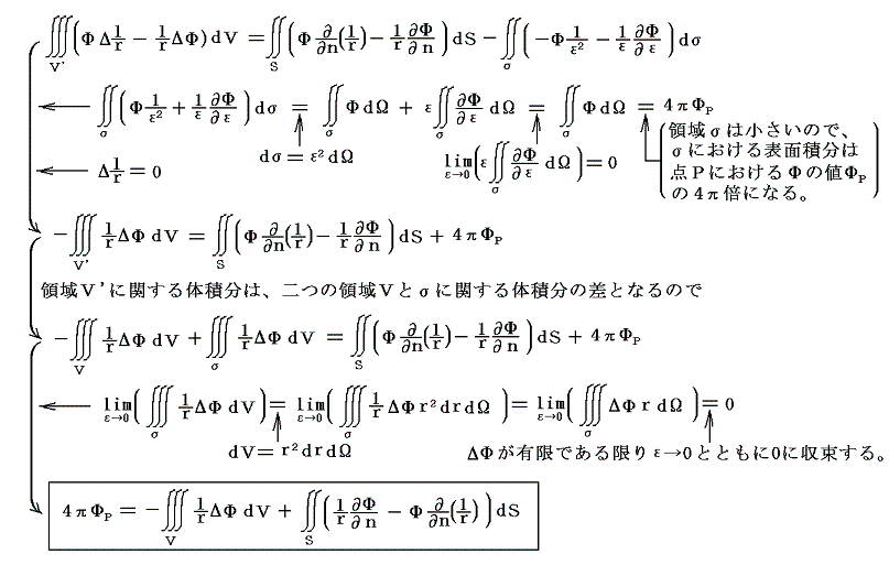 ただし、このようにすると面積分は、はじめからVの境界であった閉曲面Sに付け加えて、新しくV’の境界として現れた球面σに対しても実施しなければならない。閉曲面σに立てた外向き法線は点Pの方向を向いていることを考慮すると、次のように変形される。ここでdσは球面σの上の面積素片であるが、これが中心Pに対して張る立体角をdΩとすると、dσ=ε2dΩとなる。また領域V’内ではΔΨ=Δ(1/r)=0がいえるので