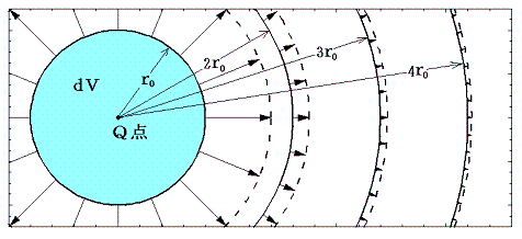 この場合体積素片dVの境界面から単位時間に外部に流れ出る流体体積がmdVと言うことです。上記の解は点Qから距離rだけ離れた位置の速度ベクトルはQから外向きに放射状に向き、その大きさが距離の二乗に反比例して小さくなることを教えてくれる。つまり下図のような状況になる。
