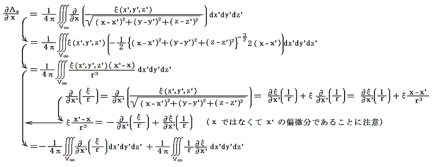 このときよく知られているように 1/r はLaplaceの方程式ΔΨ=0を満足する。このことはrを(x,y,z)と(x',y',z')の成分で表し体積積分を実施する場所の座標(x',y',z')についてラプラス演算の微分を地道に計算してみれば直ちに証明できる。これは高校で習う分数関数の微分の計算です。このとき(x,y,z)の微分ではなく(x',y',z')の微分であることに注意。従ってΔΨ=Δ(1/r)=0となるので上式は