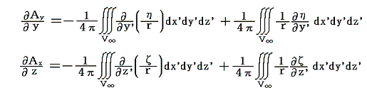 であり、dV=dx'dy'dz'である。積分はm(湧き出し)がゼロでない領域内で点Qを動かして実施する。mは点Q(x',y',z')における値を意味し、grad演算は点P(x,y,z)の座標に関するものであり、ベクトルrは積分動点Qから定点Pに向かうものであることに注意して、上記の式を用いれば、求めるべきベクトル函数v1は