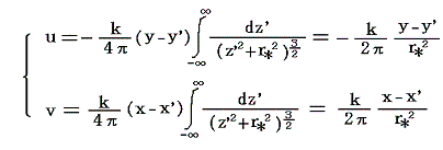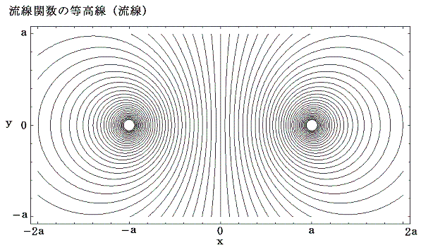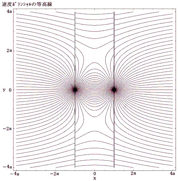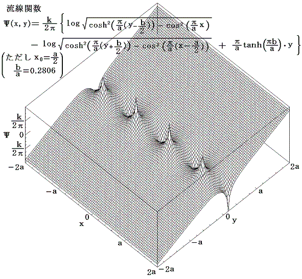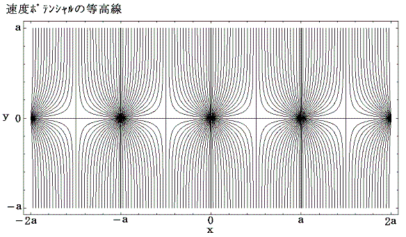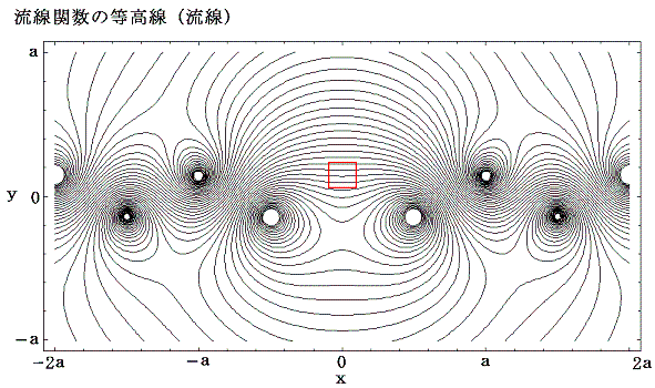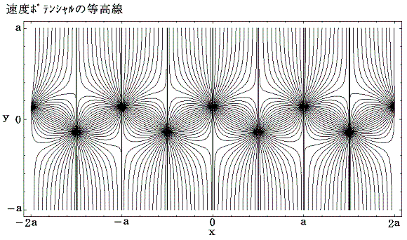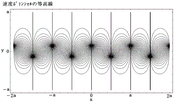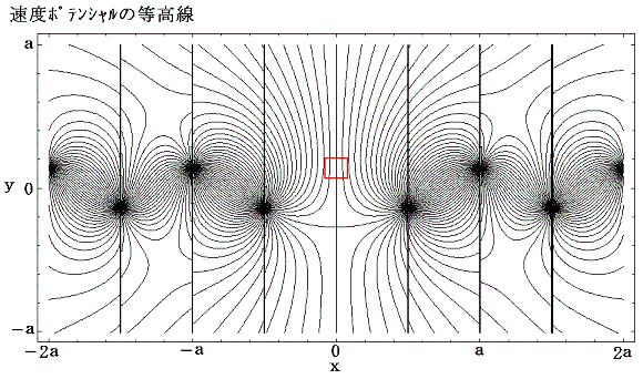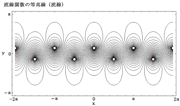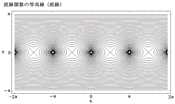 上図の様子からわかるように、渦列の影響は渦列の近くに限られることが理解できる。渦列から離れたところの流線は、速度{k/(2a)}・tanh(πb/a)の右向きの流れを表す。また渦糸に固定された座標系からみても、二本の渦列の間には左向きの流れが存在することがわかる。
