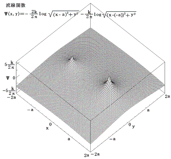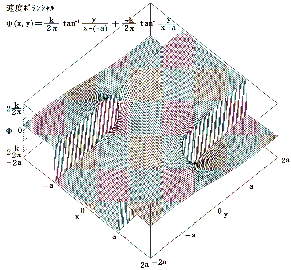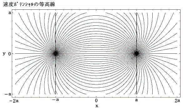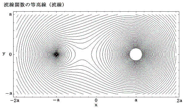 何度も注意しているように、ここでの定義では、速度ベクトルの方向は速度ポテンシャルの山をさかのぼる方向であり、流線は流線関数の山を左に見ながら流れる方向になる。