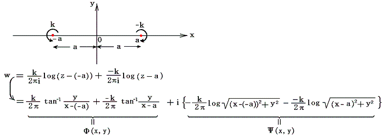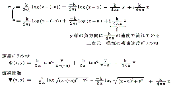 この二列の渦糸系による点z=x+iyにおける複素速度ポテンシャルw(z)は4.(3)1.と同様にして