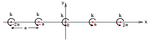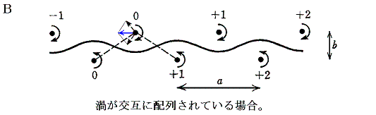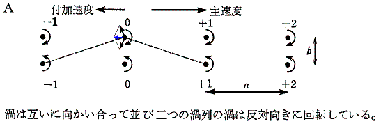 特に、x0=0(タイプA)とx0=a/2(タイプB)の場合を考察する。A、B両タイプとも二列の渦列の真ん中の層(x軸上のy=0である部分)は、平均的に左方向へ動いて行く。もちろん、その速度にはxの値の変化に伴う周期的変動はあるが、平均的大きさはA、B両タイプとも左向きにk/aである。[計算は省略]