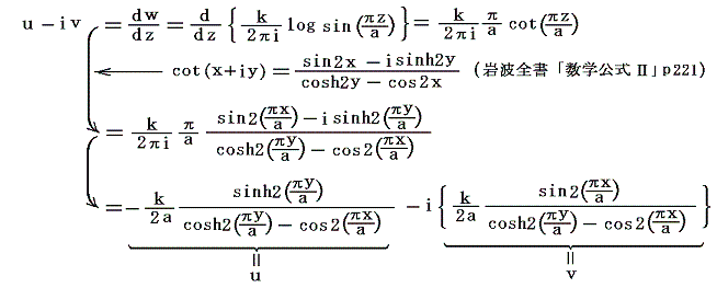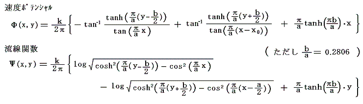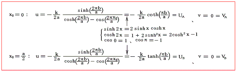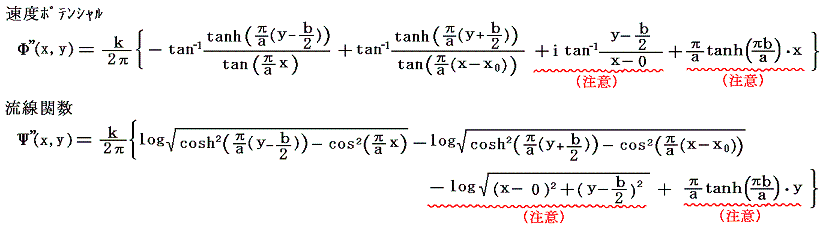 そのため、z=0+i(b/2)における渦糸が、その位置を安定に保つかどうかを調べるにはw’(z)に、5.(3)3.で導いたx軸の正の方向へ一様な速度UB={k/(2a)}・tanh(πb/a)で流れる場を表す速度ポテンシャルΦ*と流線関数Ψ*