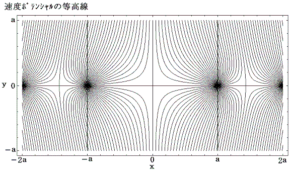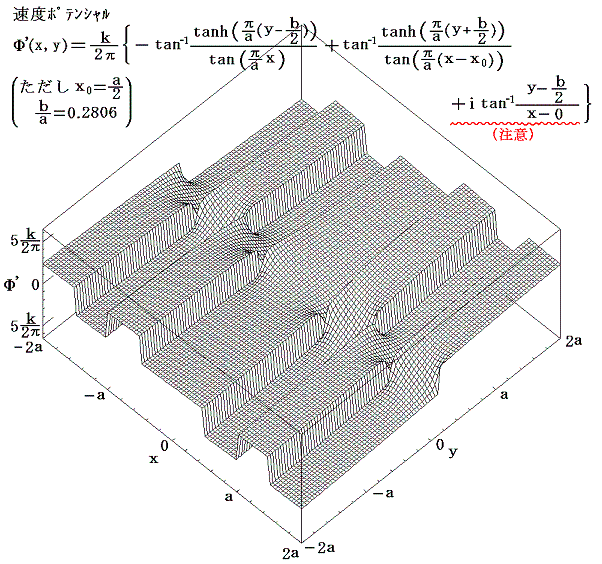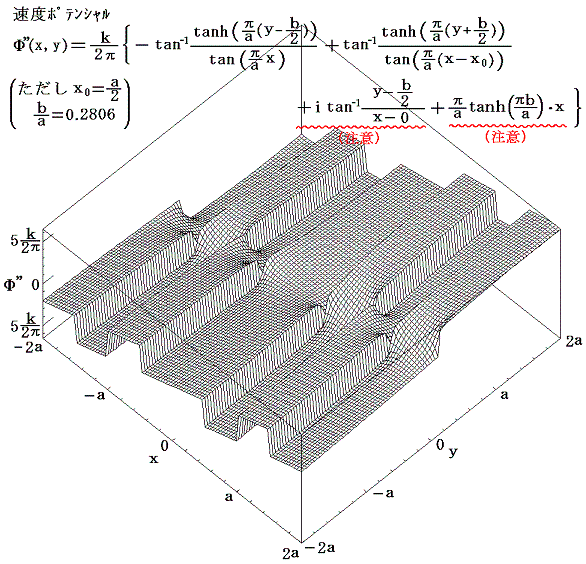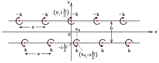 渦糸列に固定した座標系から見た複素速度ポテンシャルを図示してみる。そのためには上記の速度ポテンシャルΦ(x,y)、流線関数Ψ(x,y)に、x軸の正の方向へ一様な速度UB={k/(2a)}・tanh(πb/a)で流れる場を表す速度ポテンシャルΦ*、流線関数Ψ*