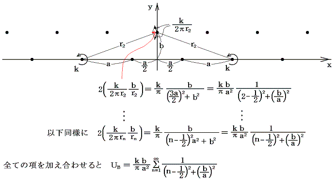 上図の赤丸と黒丸の渦列を合わせたものは、すでに求めたUAの結論のaをa/2とおいたものに等しい。そのためUBの和はUAのaをa/2に置き換えたものから、UAの結論を引いたものに等しい。そのため