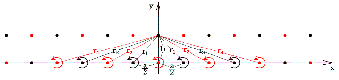 同様にして、上の列のz=0+ib/2の点にある渦糸の共役複素速度は