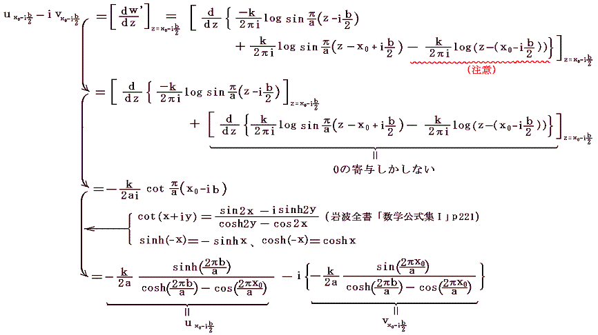 最初に点z=x0−ib/2に存在する渦糸の位置の共役複素速度を求める。4.(3)4.で見たように、渦糸系がただ一列存在する場合は動かなかったから、たとえばz=x0−ib/2の点の渦糸に対してy=−ib/2の位置にある渦列の寄与はゼロとなる。そのためz=x0−ib/2にある渦糸に影響するのは、前記wから点z=x0−ib/2の渦糸を取り除いた複素速度ポテンシャルw’の前半部分[つまりy=+ib/2の位置にある渦糸列]だけです。そのためz=x0−ib/2点の共役複素速度は