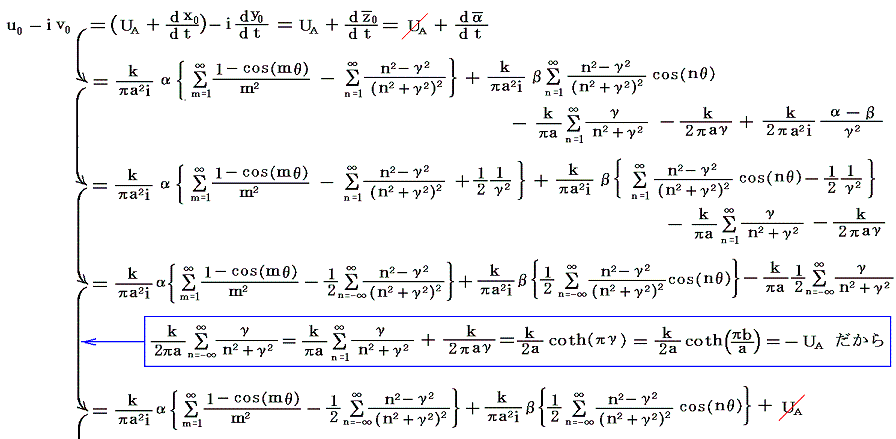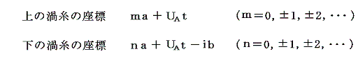 この渦列全体は前章で求めた速度UAで左方へ動くから、任意時刻tにおける渦糸系の座標は