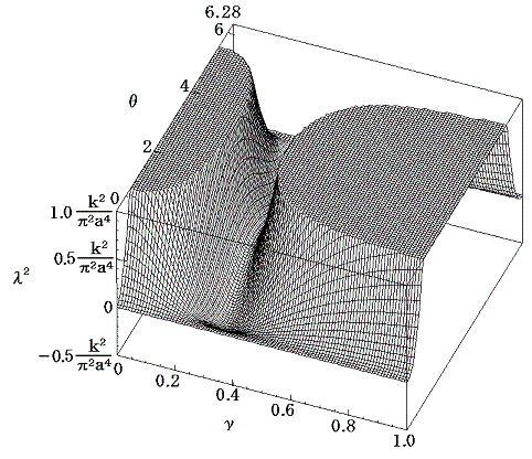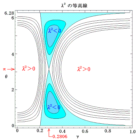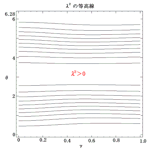 グラフから明らかなように、θとγのどの値の範囲でもつねにλ2>0となるのでλは実数となり、αは時間と共に増大するため、この配列の渦列は不安定である。
