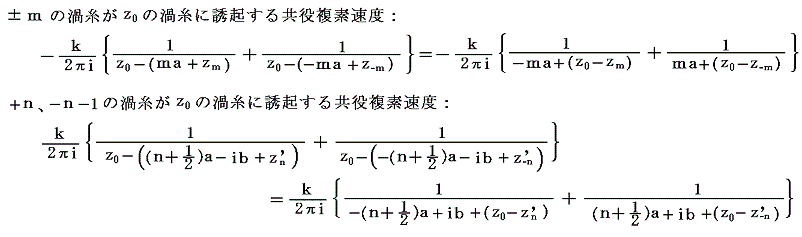 このとき、x0、y0の位置にある渦糸に対する上の列のm、−mなる二つの渦糸による共役複素速度、下の列のn、−nなる二つの渦糸のによる共役複素速度、およびn=0の渦糸によるよる共役複素速度は3.(3)2.より