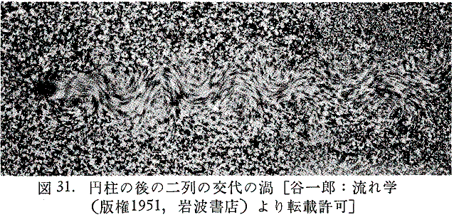 図31に見られる渦の配列は、私の名前と結びついていていて、普通に‘カルマンの渦街’または‘カルマンの渦列’と呼ばれます。しかし私は、この渦を発見したのが私であるとは主張しません。それは、私の生れるずっと前から知られていたのです。私がこの渦を見た一番古い絵は、イタリヤのボローニャの教会にあるもので、セント・クリストファが幼いキリストを抱いて、流れを渡っているところなのですが、聖徒の裸の足のうしろに、二列の交代の渦が描かれていました。このように物体のうしろにできる交代の渦については、イギリスの科学者、ヘンリー・R・A・マロック(1907)、それからフランスの大学教授、アンリ・ベナール(1908)によって観察が行われ、写真に撮影されたりしていました。ことにベナールは私の前に、かなりの仕事をこの問題についてやっていましたが、主として非常に粘い流体、またはコロイド溶液に起る渦を実験していて、その立場は、空気力学というよりは、むしろ実験物理学と言った方がよいでしょう。それでも彼は、渦が私の名前で坪ばれることにやきもちを焼き、一度ならず、例えば国際応用力学会議の席上、1926年にチュ一リッヒ、1930年にストックホルムで、この現象を古くから観察していた優先を主張しました。あるとき私は答えて、“ベルリンとロンドンでカルマン街と呼ばれるものが、パリでアンリ・ベナール街と呼ぱれることに賛成します”と言ったのですが、この冗談で私たちは和解し、それからよい友だちになりました。