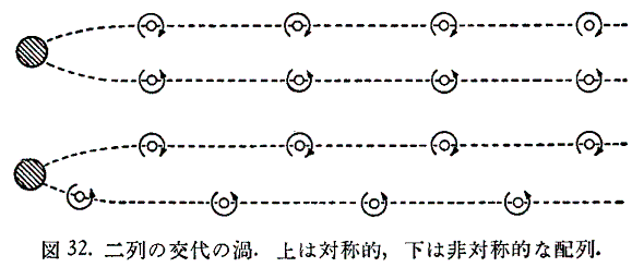 その一つは図32の上半に示すような対称的な渦の配列、これは渦層をおきかえるのにまず考えられる形でしょうが、この配列が不安定であることを、私がはじめて証明したのです。そして、図32の下半に示すような非対称的な配列だけが安定で、それも二つの列の問隔と、一つの列の中での渦の間隔との比が、ある特定な値を持つ場合に限って、安定であることを発見したのです。