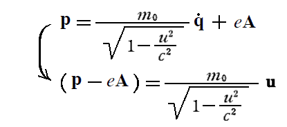 まず、前述の運動方程式のローレンツ力の表現を電磁場のスカラーポテンシャルφ、ベクトルポテンシャルAによる表現で置き換える。そうすると相対論的な運動方程式は