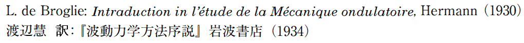 ルイ・ド・ブロイが1930年に書いた波動力学の教科書です。渡邊慧翻訳で1934年に発刊(岩波書店)された訳本から引用しています。訳文はカタカナ表記の堅苦しい文章ですので、大幅に改変しています。原文はこちらでご確認下さい。