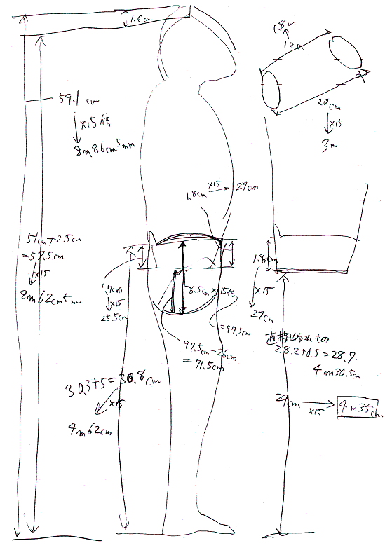 最初は腹部から上の上半身(胴体、頭部、腕)と下半身に二つの部分を別々に作り、上半身は、高さ4mの柱で支えた下図の様な板の上にのせ、下半身はその板にぶら下げるような形で設置できるだろうという予想で始めた。しかしこの予想は甘すぎた。