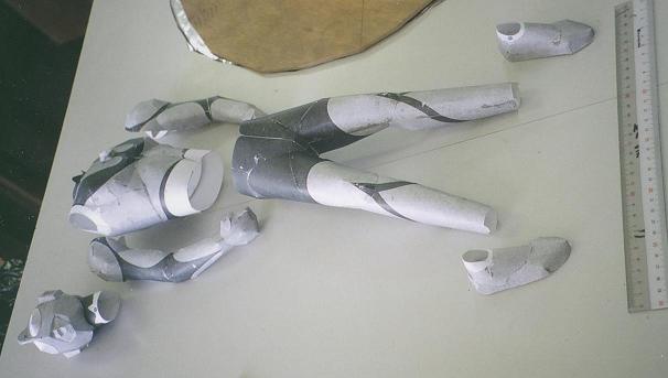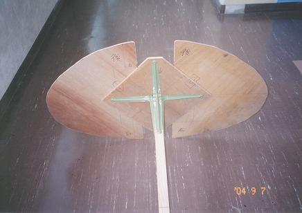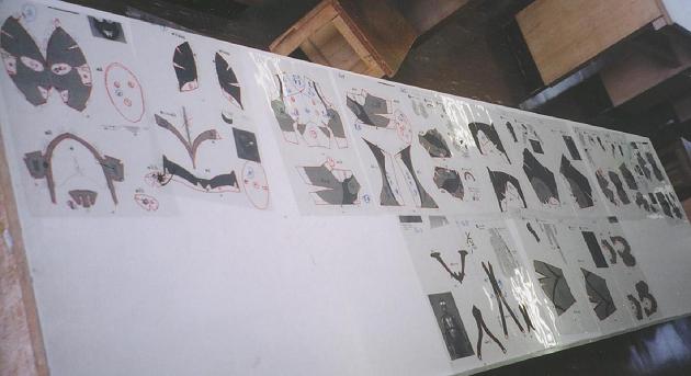 下写真はセルの貼り合わせに先立つて全体の形を確かめるために作った模型。この模型とOHP用のセルとを付き合わせて、細部の形と貼り合わせ手順を確認しながら、セロテープでフィルムを貼り合わせていく。