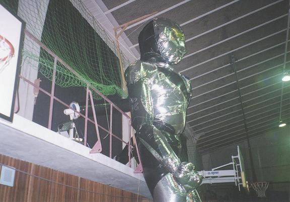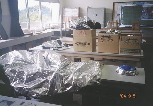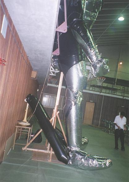 各部分の貼り合わせが完成した上半身と下半身を完成。体育館に持ち込んで最後の組み立てにはいる。しかし、扇風機の風圧では上半身を安定して設置板の上に留め置くことができず、どうしても腹部に加重がかかり、座屈してしてつぶれてしまう。この部分の強度の見積もりが徹底的に甘かった。