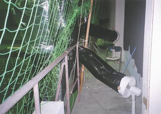 仕方がないので急遽、背後に柱を立てて頭部を上からつり上げる事にした。そして扇風機を当初の予定より1台増やして、上半身2台、下半身1台の計3台にしてなんとか設置することができた。