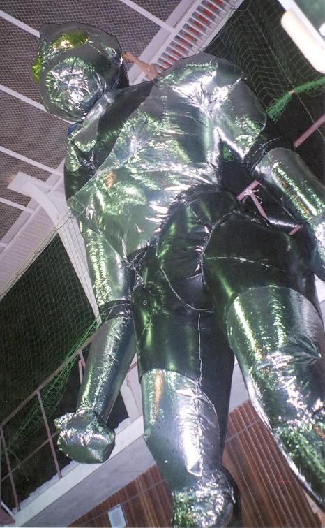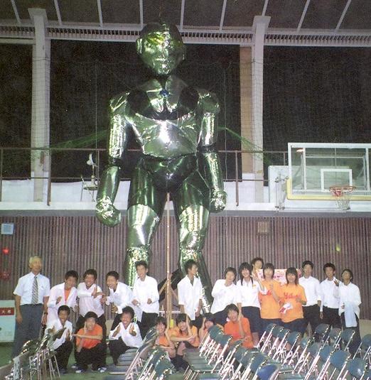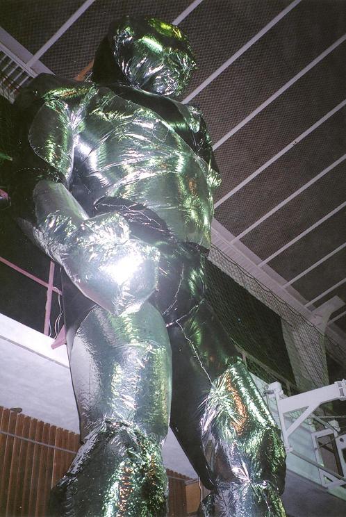 これは2.で説明したゴジラと同じ発想の企画です。ゴジラで、このやり方の見通しが立っていたので、今度は立像でやってみようということで作ったものです。水稲育苗用のソーラーフィルムとして反射能のある銀色のフィルム(本州太陽シート 王子製紙制 幅2m×長さ50mのもので6,804円)があることがわかったので作ることができた。
