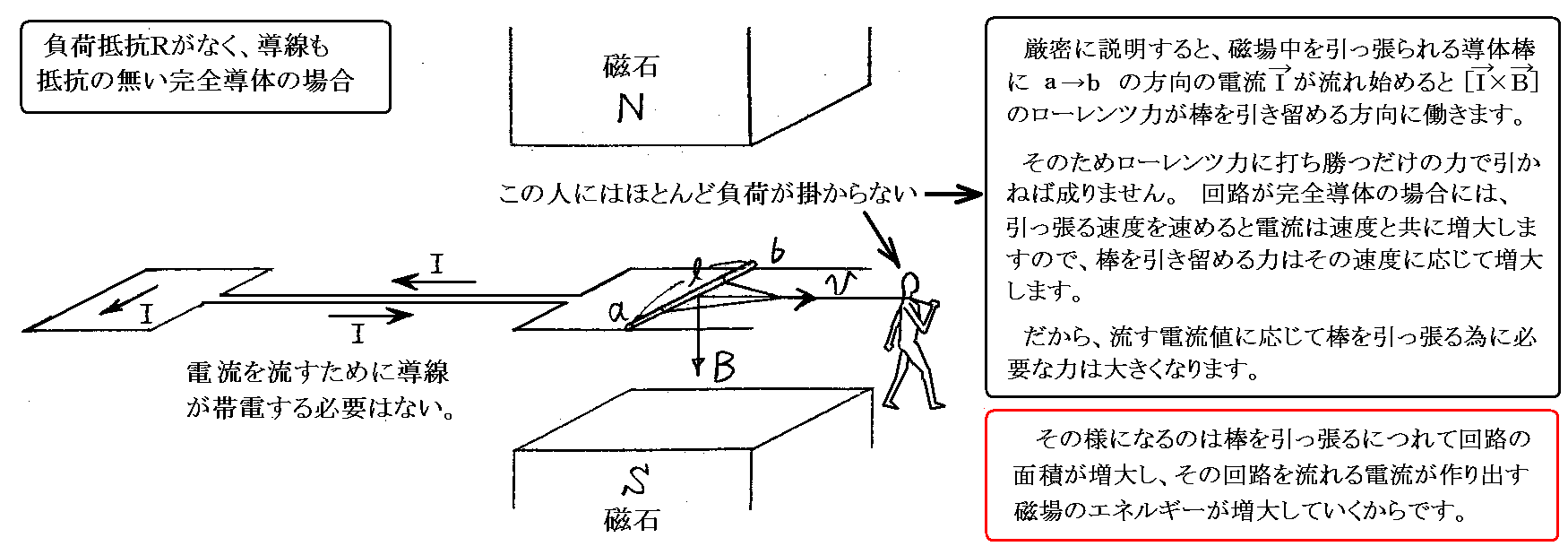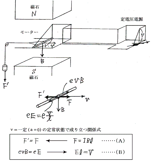 一方抵抗の部分ではI=V/R式(3)で定まる電流Iが流れる。この電流により磁場中におかれた導体棒abには速度ベクトルvとは逆向きの力F’=IBl式(4)を生じる。定常状態ではこの力F’と人が引く力Fとがつり合いF’=F式(5)が実現される。 つまり発電機に加えられる力Fが発生する電流Iを決め、棒abを引っ張る速度vがab間の電位差Vを決める。そうして定まったIとVはV=RI式(3)のオームの法則を満足する。