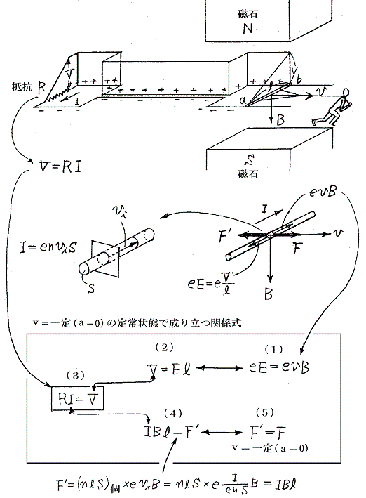 このためb2〜b1の導線に電荷が詰まってとどこおり電位が高くなる。そしてb1はa1よりVだけ高電位になり、この電位差が金属棒(1)の内部にE1=V/l1の電場を生じる。この電場が力eE1=eV/l1を生じる。これが力ev1B1とつり合っており定常状態が実現される。